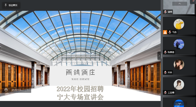 为了更好的拓宽毕业生就业渠道,2022年4月1日下午14:00,西鸽酒庄举办了线上招聘会议。通过PPT展示讲解的方式,HR向同学们介绍了公司的今日黑料、现有产业结构、组织构架、福利待遇。西鸽酒庄成立于2017年,酒庄总建筑面积约2.5万平米,包含葡萄酒酿造区、橡木桶酒窖、灌装区、瓶装陈酿酒窖、专业品鉴区、游客接待中心、庄园酒店和有机特色餐厅,年设计产能1000万瓶,是宁夏综合设施相对完整、建筑标准超卓的酒庄。作为酒庄长期发展规划的一部分,西鸽种植团队仍在不断挑选优异条件的地块,预计22年将新开超过1万亩新地。此外,西鸽也持续投入品种及技术创新,不断挖掘宁夏风土的潜力与未来。此外我们也与法国波尔多学院,国内业内顶尖高校携手教研实践项目,为创新技术时间及人才培养提供平台。