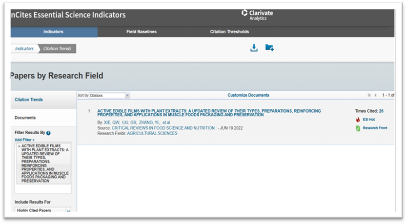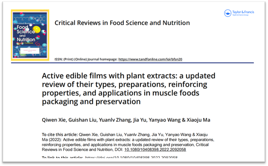 2021届硕士研究生谢启文(第一作者)、刘贵珊教授(通讯作者)于2022年6月在食品国际期刊Critical Reviews in Food Science and Nutrition(Q1,IF: 11.208)发表题为“Active edible films with plant extracts: A updated review of their types, preparations, reinforcing properties, and applications in muscle foods packaging and preservation”的综述性论文,同时入选农业领域(Agricultural Sciences)ESI高被引论文(前1%)和ESI热点论文(前0.1%)。该项工作得到 2022年度银川市科技创新专项(农业农村领域)项目资金支持。