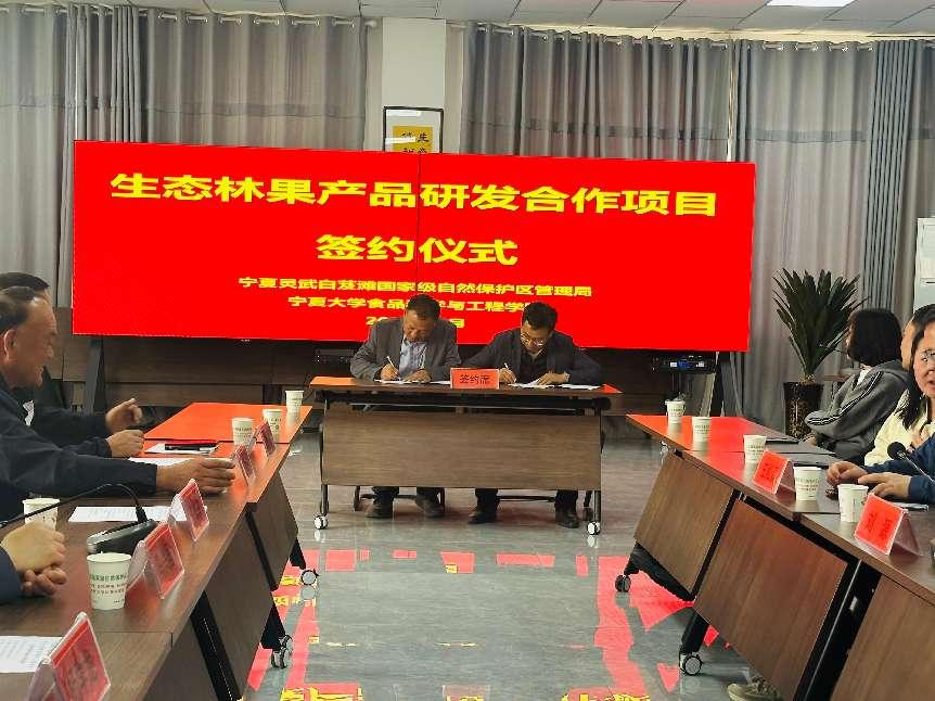 科技人才助力产业新质生产力发展、真正把绿水青山变成金山银山的迫切愿望。学院党总支书记李文华表示,白芨滩的生态治理经验为食品学科发展提供了重要启示:“沙区特色农产品的深度开发、功能性食品研发与生态价值转化,是未来双方合作的重点方向。”座谈交流中,学院方海田副院长、李亚蕾教授、章中教授、范艳丽教授分别从微生物发酵、食品加工技术、无损检测、营养成分提取等角度,提出将沙区资源转化为高附加值产品的具体思路。双方还围绕沙区药食同源植物开发、生态产业链延伸等议题展开讨论,并签订《产学研战略合作框架协议》,约定在科研攻关、学生实践基地建设、成果推广等方面开展深度合作。