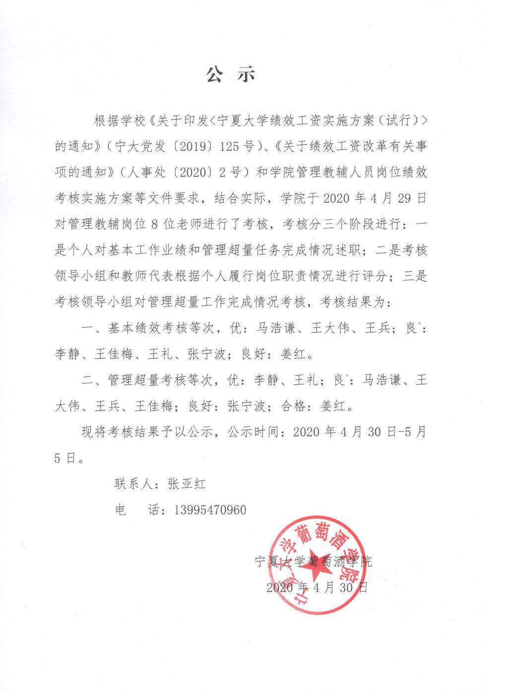 葡萄酒学院管理教辅人员岗位绩效考核结果公示